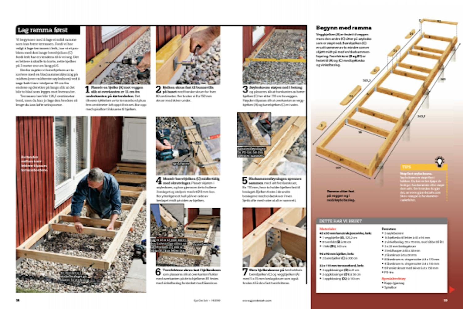 Vi begynner med å lage ei solid ramme som kan bære terrassen. Fordi vi har valgt å lage terrassen i lerk, har vi et problem med den lange bærebjelken (C) fordi lerk har en tendens til å vri seg. Det er lettere å skaffe to korte, rette bjelker på 3 meter enn en lang på 6.