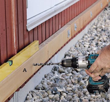Plassér en bjelke (A) mot veggen slik at overkanten er 11 cm fra underkanten på dørterskelen. Det tilsvarer tykkelsen av to terrassebord pluss fem centimeter luft opp til trinnet. Bor opp med spiralbor til skruene til bjelken.