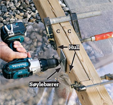 Montér bærebjelken (C) midlertidig med skrutvinger. Plassér skjøten i søyleskoen, og bor gjennom de to hullene i beslaget og stolpen med et Ø 8 mm bor. Bor ytterligere et hull på hver side av beslaget midt på siden av bjelken.