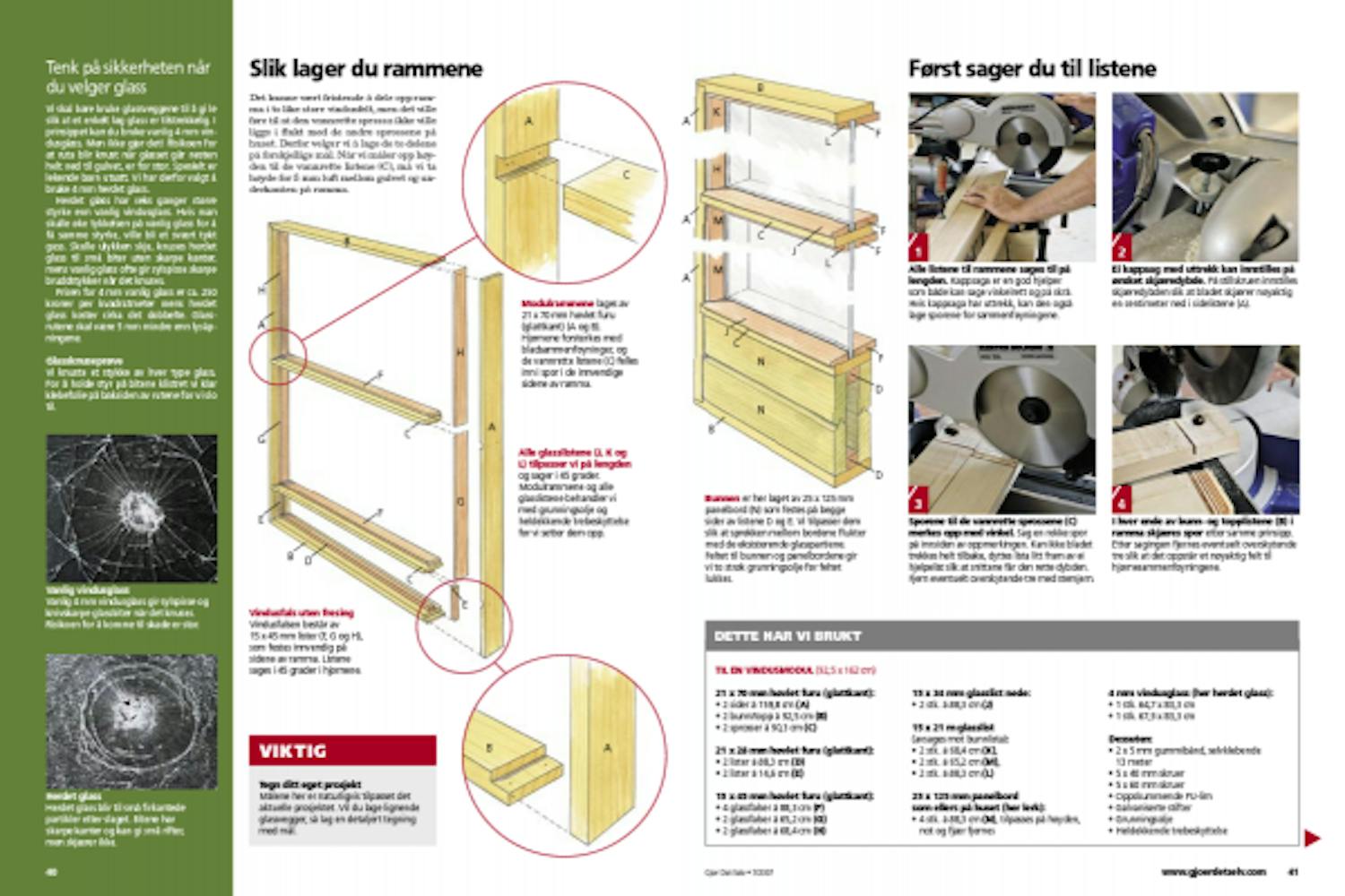 Glassene holdes på plass med glasslister som også får pålimt 2 x 5 mm gummibånd. Båndene settes først på etter at listene er sagd til etter mål, grunnet og malt. Lista som er vist her, plasseres i toppen og sages i grader på hver side.