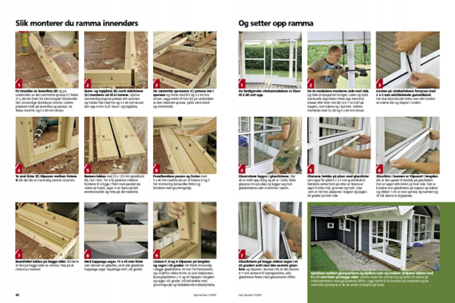 De to modulene monteres side mot side, og hele vinduspartiet bringes i vater og lodd. Eventuelle skjevheter rettes opp med små klosser eller kiler. Det blir 0,5-1 cm luft på toppen, mot sidene og i bunnen. Delene monteres med 5 x 40 og 5 x 60 mm skruer.
