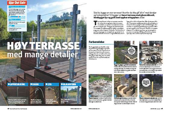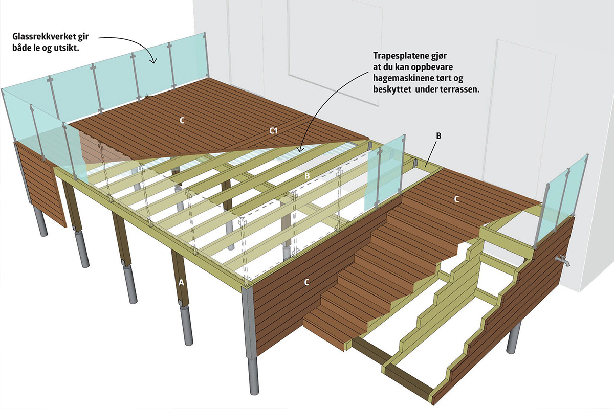 Du skal holde tungen rett i munnen når du plasserer de trykkimpregnerte stolpene og glassrekkverket. Monteringen av terrassebordene går raskt unna.