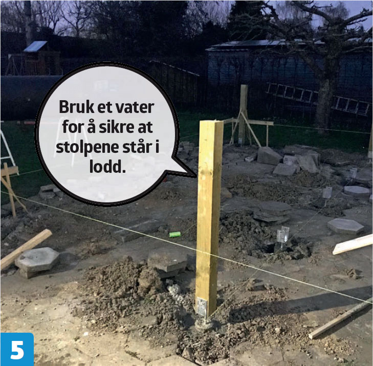 Før du gjør første spadestikk, er det en god idé å lage fire galger og trekke en murersnor. Da kan du se om du er fornøyd med størrelsen på terrassen. I tillegg sikrer du at vinklene blir rette. Når galgene står riktig, kan du enkelt markere hvor de respektive stolpene skal plasseres.