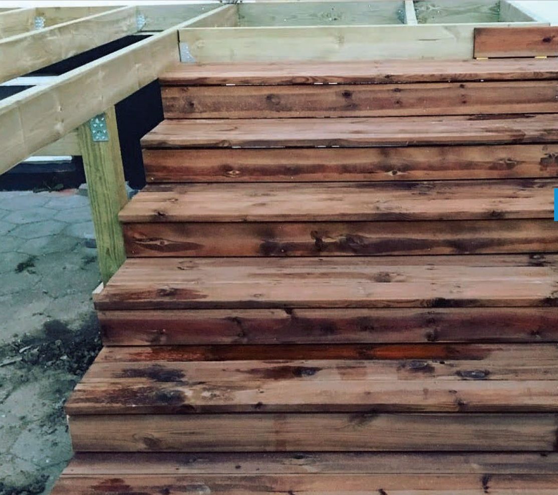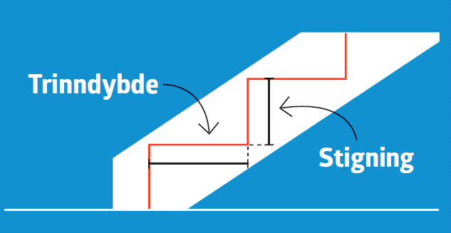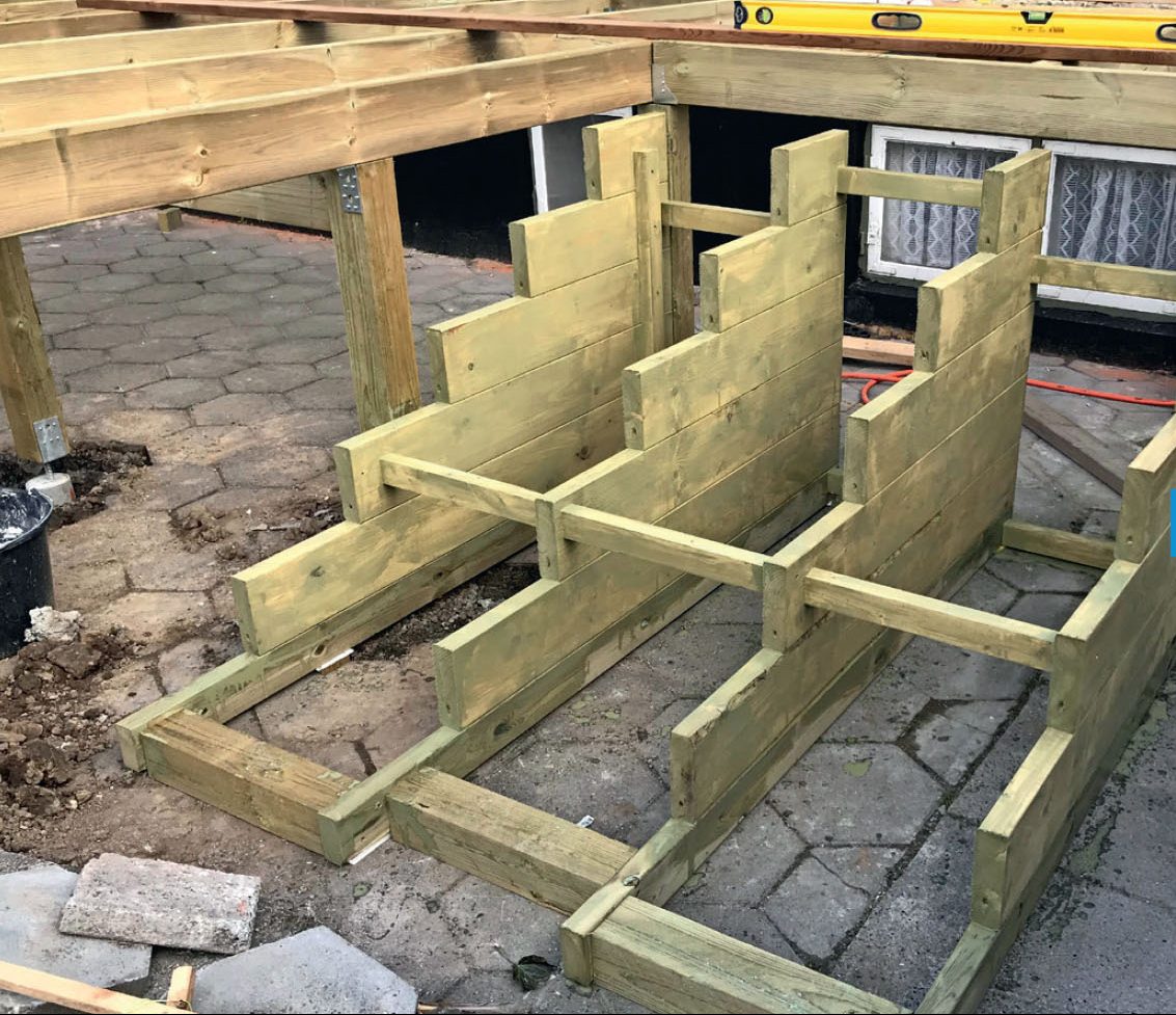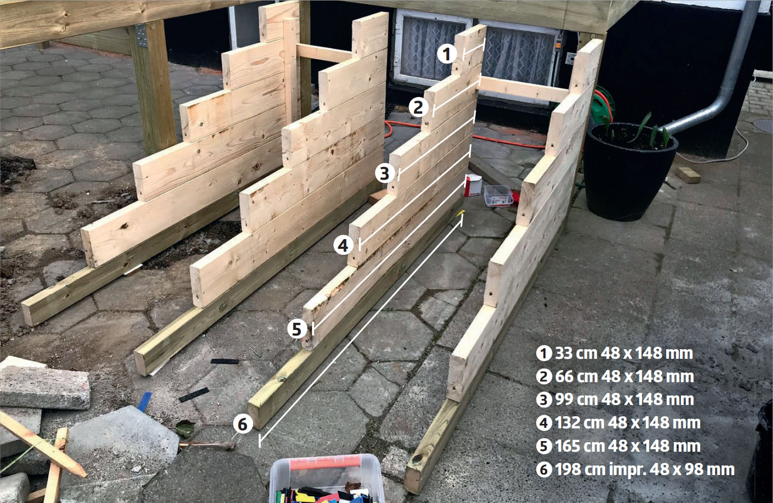 For å få helt riktig størrelse, bygger vi trappen vår selv. Vi bruker vanlig hvit 48 x 148 mm som vi lar hvile på en trykkimpregnert 48 x 98 mm i bunnen.