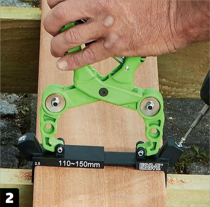 Fordi vi helst vil ha skjulte skruer på terrassen, men samtidig vil slippe å proppe samtlige hull i bordene, har vi valgt å benytte oss av et spesielt monteringssystem fra Essve, som gjør det enkelt å montere skruene i en vinkel på 45 grader. Når du har montert det første bordet og funnet ut av fremgangsmåten, går det som en lek.