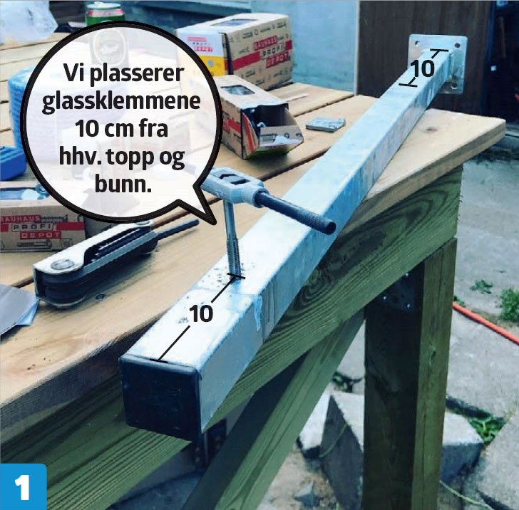 For å bevare utsikten og samtidig gi le på terrassen, kjøper vi noen galvaniserte stolper som vi skjærer gjenger i. Deretter monterer vi glassklemmer, som er en type beslag beregnet til å holde glass. Når klemmene er på plass, monterer vi et sikkerhetsglass som kan tåle både lekende barn og villfarende fotballer.