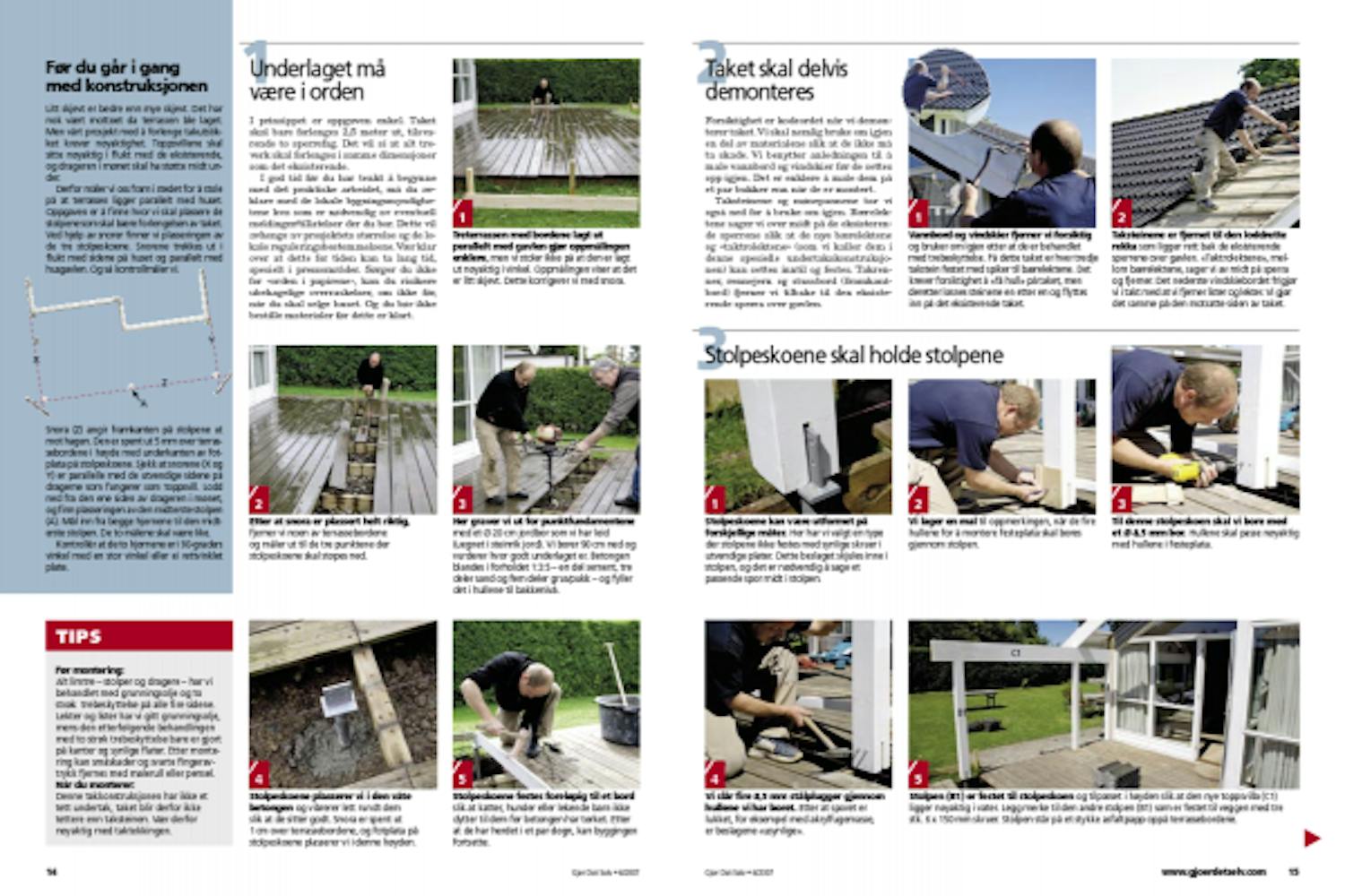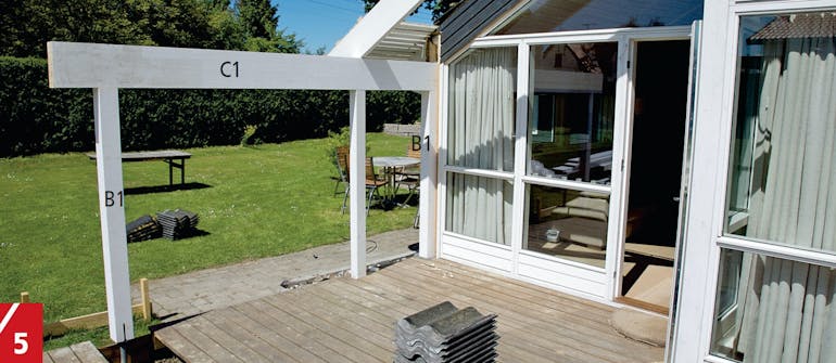 I prinsippet er oppgaven enkel. Taket skal bare forlenges 2,5 meter ut, tilsvarende to sperrefag. Det vil si at alt treverk skal forlenges i samme dimensjoner som det eksisterende.
