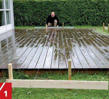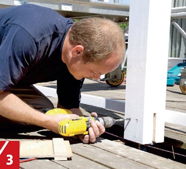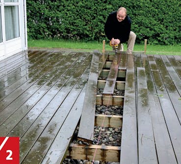 Etter at snora er plassert helt riktig, fjerner vi noen av terrassebordene og måler ut til de tre punktene der stolpe skoene skal støpes ned.