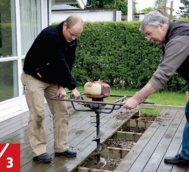 Her graver vi ut for punktfundamentene med et Ø 20 cm jordbor som vi har leid (uegnet i steinrik jord). Vi borer 90 cm ned og vurderer hvor godt underlaget er. Betongen blandes i forholdet 1:3:5 - en del sement, tre deler sand og fem deler grus/pukk - og fyller det i hullene til bakkenivå.