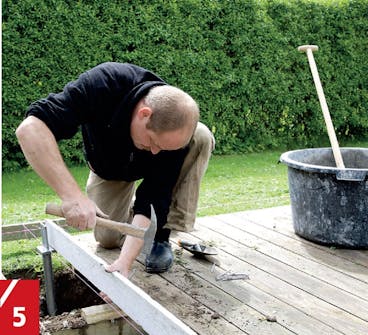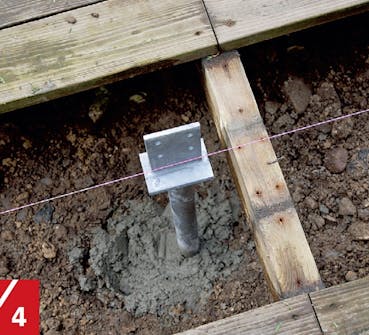 Stolpeskoene plasserer vi i den våte betongen og vibrerer lett rundt dem slik at de sitter godt. Snora er spent ut 1 cm over terrassebordene, og fotplata på stolpeskoene plasserer vi i denne høyden.