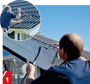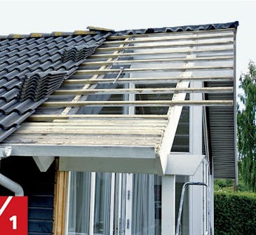 Taksteinene er fjernet til den loddrette rekka som ligger rett bak de eksisterende sperrene over gavlen. «Taktrolektene», mellom bære lektene, sager vi av midt på sperra og fjerner. Det nederste vindskiebordet frigjør vi i takt med at vi fjerner lister og lekter. Vi gjør det samme på den motsatte siden av taket.