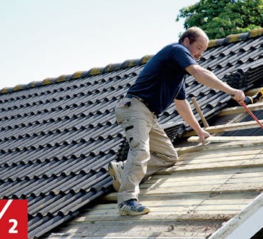 På sperrene spikrer vi først på avstandslektene (23 x 48 mm). Dette gjøres for å ende opp likt med gamletaket. Deretter merker vi av bærelektavstanden fra overkant til overkant som på de eksisterende sperrene. Lektene legger vi opp i 20-30 cm overlengde og sager til i riktig lengde etter oppmåling med takstein.