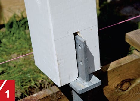 Stolpeskoene kan være utformet på forskjellige måter. Her har vi valgt en type der stolpene ikke festes med synlige skruer i utvendige plater. Dette beslaget skjules inne i stolpen, og det er nødvendig å sage et passende spor midt i stolpen.