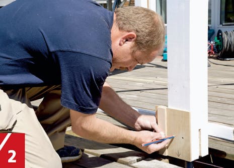 Vi lager en mal til oppmerkingen, når de fire hullene for å montere festeplata skal bores gjennom stolpen.