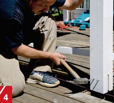 Vi slår fire 8,5 mm stålplugger gjennom hullene vi har boret. Etter at sporet er lukket, for eksempel med akrylfugemasse, er beslagene «usynlige».
