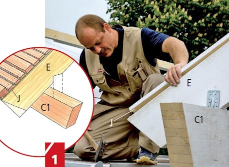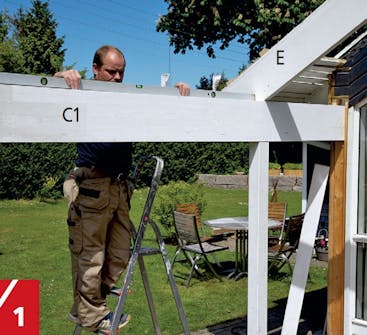 Sperrene legges her opp med en cen-teravstand på en meter, og festes med 65 x 90 mm ribbeforsterkede vinkelbeslag og 5 x 35 mm beslagskruer. Vi bruker vinkelbeslag på begge sider av sperrene.