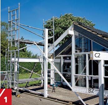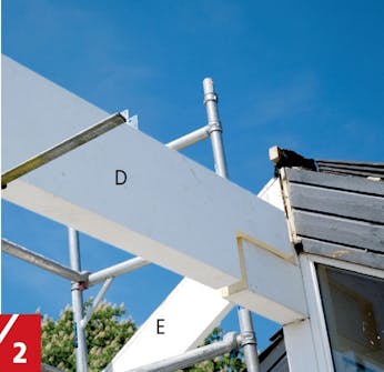 Det eksisterende utstikk er understøttet av ei toppsvill og en stolpe. Vi lar stolpen stå, men skifter ut toppsvilla i hele dens lengde. På dette huset er ikke toppsvilla ført inn i veggkonstruksjonen, men er bare festet til veggen med vinkelbeslag. Det er derfor enklere å skifte ut toppsvillene i stedet for å skjøte den gamle og den nye. Vi understøtter midlertidig den eksisterende sperra mens vi skifter ut toppsvilla.