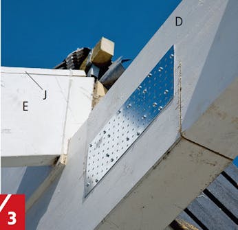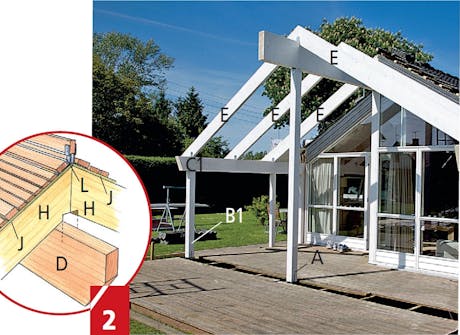 Vi lager ikke undertak på utstikket, men for å få lektene opp i samme høyde som de eksisterende må det spikres tilsvarende avstandslister (J) oppå de nye sperrene.