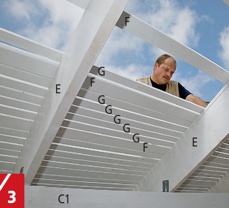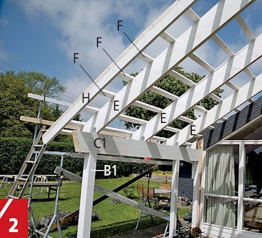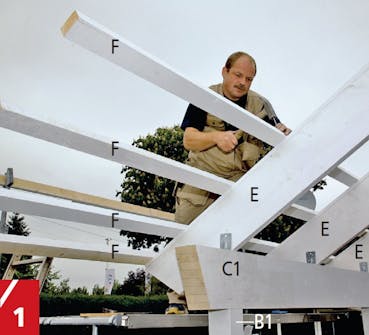 Høyre og venstre side oppfører vi på samme måte, bare speilvendt. Toppsvillene (C1 og C2) skal plasseres i nøyaktig samme høyde, og de hviler på stolpene (B1 og B2) der den fremste er festet til stolpeskoen, og den bakerste til bindingsverket i veggen.