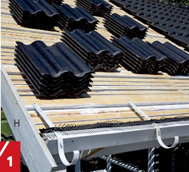 Nå skal du måle ut til vindskia. Vi legger opp den nederste rekka med takstein og tilpasser utstikkets lengde slik at vi unngår å måtte skjære til taksteinene. Lektene sager vi av, og vi setter opp det nederste vindskiebordet.
