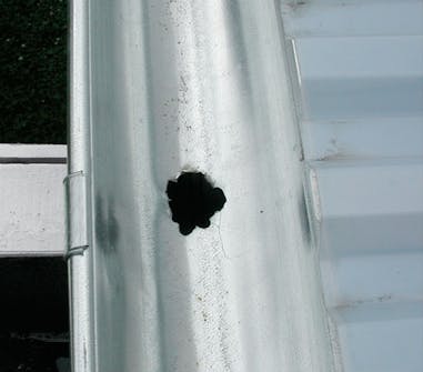 Til byggherrens fortvilelse ble de galvaniserte stål-takrennene levert uten avløpshull. Det må du lage selv. Dette hullet lagd med boremaskin er ikke vakkert, men det virker etter hensikten. Inntil det første store bladet tetter det.