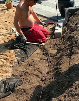 Det settes kantblokker til en mur. Den skiller terrassen fra gressplenen. Vi har gravd en renne til kantblokkene og spent ut en snor, som kantblokkene settes etter.