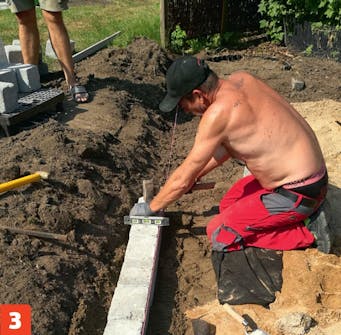 Kantblokkene bankes på plass i betongen. Det er viktig at den første rekken stein står helt rett, slik at muren ikke blir skjev. Sjekker du flittig med vateret, forsikrer du deg om at steinene blir stående rett.