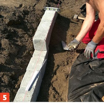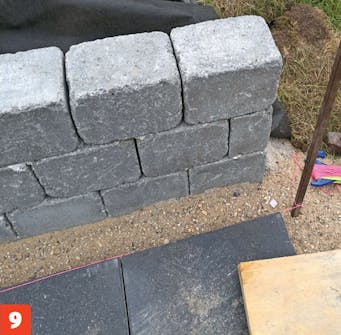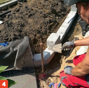 Muren lages av kantblokker som settes i forband, tre rekker oppå hverandre. Det er viktig at du er nøye med å sette den første rekken helt rett. Det sikrer at resten av muren også blir rett.