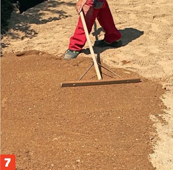 Legg avrettingsgrus oppå bærelaget i et lag på cirka 2-3 cm. Til en flate som dette, trekkes grusen enkelt ut med en asfaltrake.