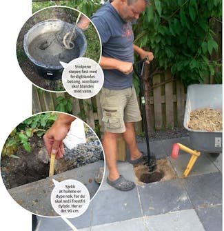Grav hull til stolpene (A og B), fem i alt. Vi begynner med å grave ut til den ene av de to stolpene som skal plasseres i belegningen. Er underlaget uten altfor mye og store steiner, er et jordbor smart å lage hull i en belegning med.