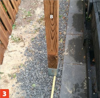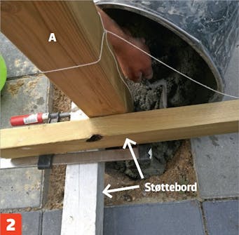 Hjørnestolpen (A) støpes fast. Det er viktig at den står helt rett. Spikre eventuelt fast et par støttebord som kan holde den. I bunnen legger vi grus, så stolpen ikke står direkte på den fuktige jorden.