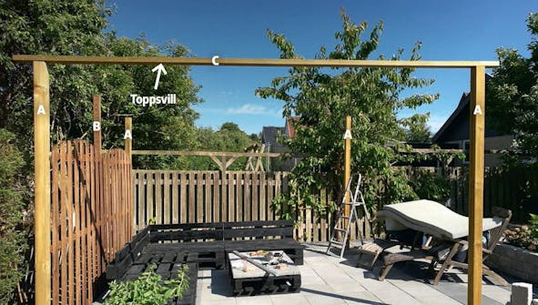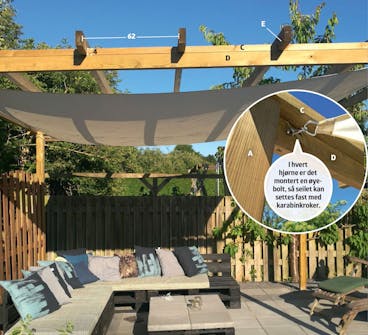 Pergolaen består av fem stolper - en i hvert hjørne og en midtstolpe på den ene langsiden. På toppen av begge settene endestolper plasseres en tverrgående toppsvill. Den stabiliserer konstruk-sjonen og er samtidig underlag for de langsgående sperrene, som plasseres med litt avstand så “taket” blir luftig. I hvert hjørne av pergolaen monteres en øyebolt til festing av solseilet.