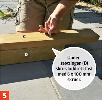 Toppsvillen (C) skrus fast til stolpene med 6 x 100 mm skruer. Den loddrette under støttingen (D) plasseres mellom stolpene (A), slik at den flukter med ytterkanten.