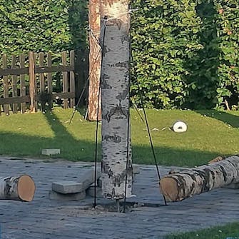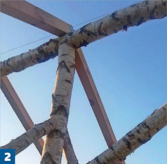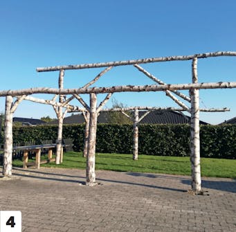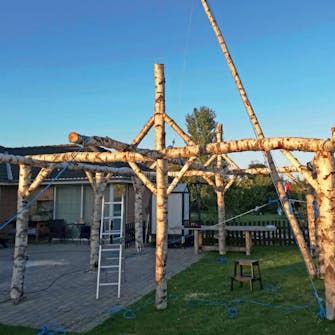 Lag avstivinger mellom de loddrette stolpene og takåsene. Skråstiverne er laget av mindre bjørkestokker på cirka 50 cm, som kappes skrått i begge ender. Skru fast skråstiverne til takåser og stolper med 6 x 130 mm skruer - husk forboring, slik at stokkene ikke sprekker.