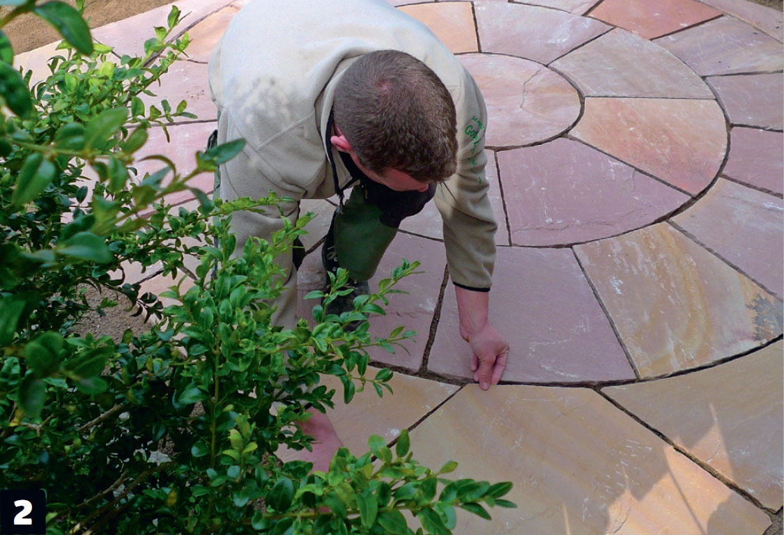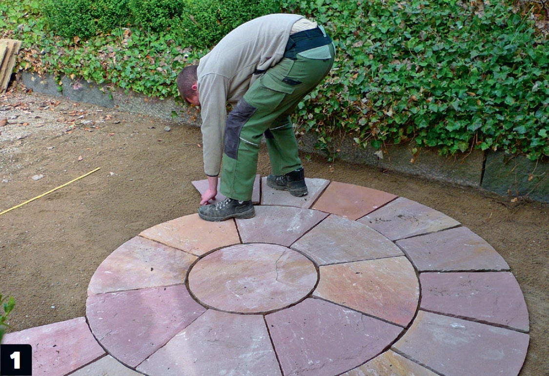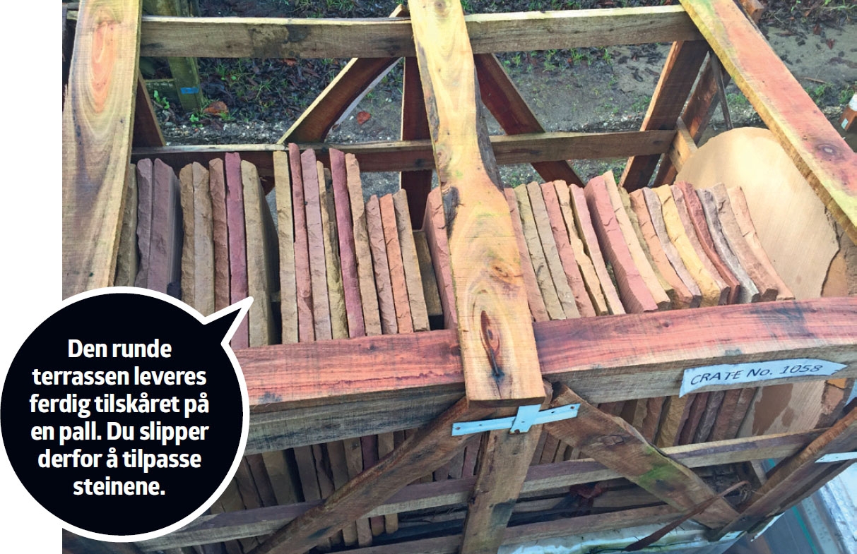 Den midterste runde steinen plasseres i sentrum av terrassen. Når den er lagt, er det bare å legge de buede steinene i sirkler rundt den. Og jobben går fort, for det er ingen steiner som skal skjæres til.
