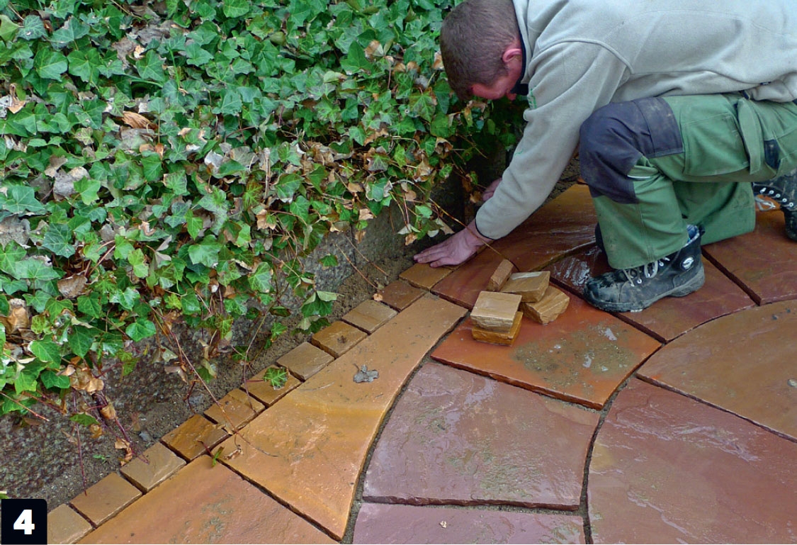 Steinene legges. Begynn med den midterste runde steinen, og beveg deg utover, rekke for rekke. Steinene er jevne i tykkelsen, så de er raske å legge.