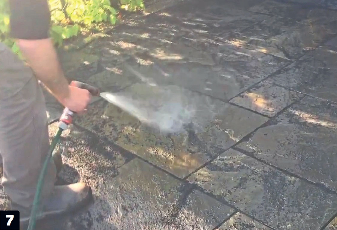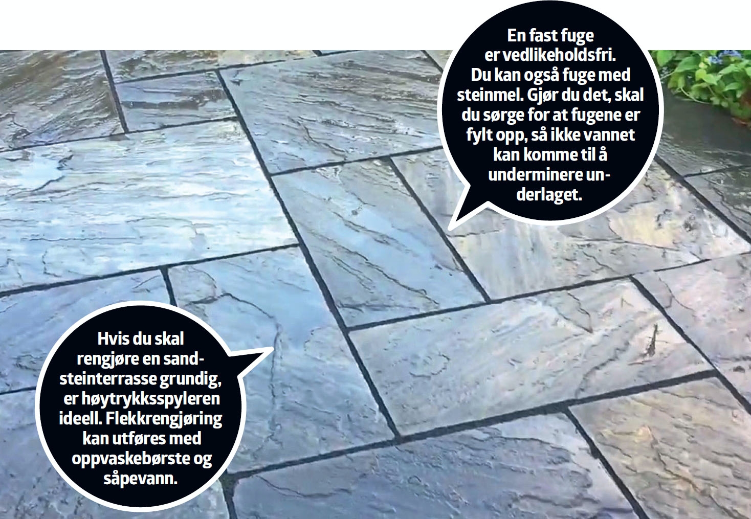 Terrassen fuges. Men først skal den vaskes ren - det går fort og gjøres enkelt med en høytrykksspyler, men en hageslange kan også brukes. Sørg for at fottøyet ditt er rent, så du ikke drar inn jord og grus på steinene. Tøm ut fugematerielet på belegningen.