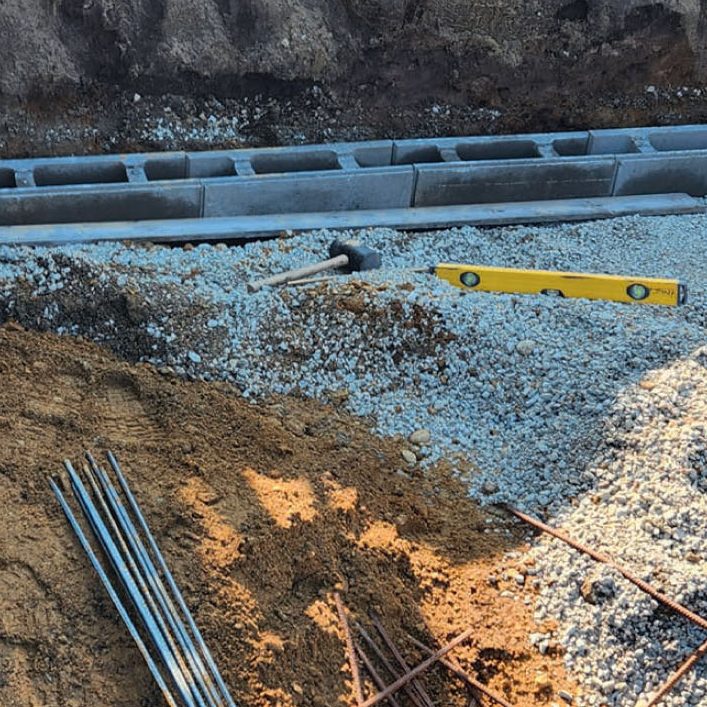 Vi leier en minigraver, og graver ut til ønsket dybde. Vi graver også en renne ned til frostfri dybde til fundamentblokkene.