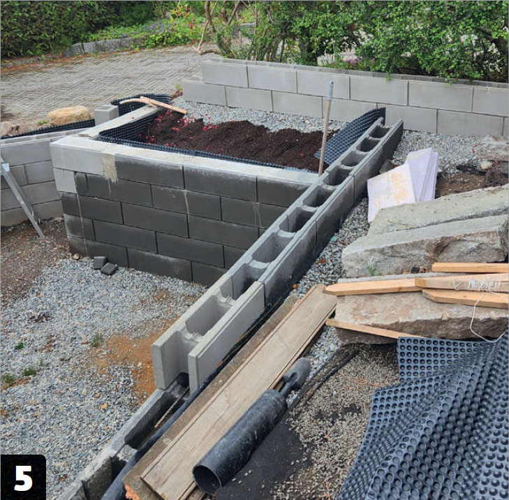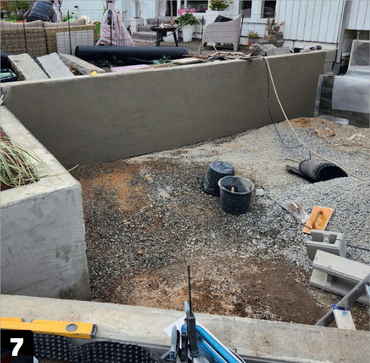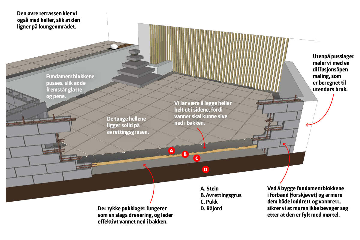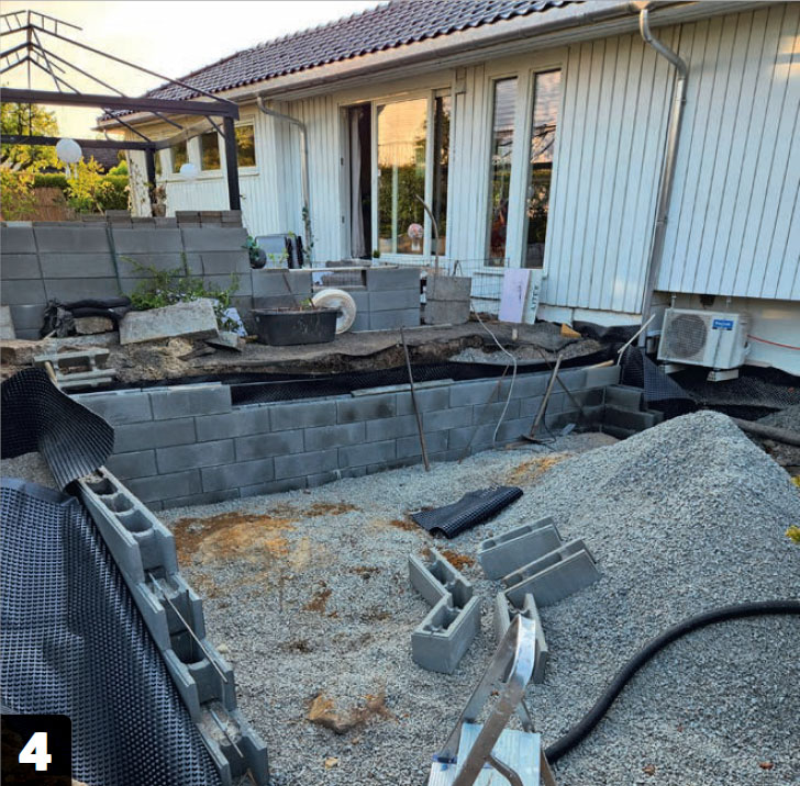 Bygg opp resten av fundamentblokkene, slik at muren kommer opp i ønsket høyde. Her bygger vi et høybed inn i konstruksjonen, slik at vi får litt mer grønt i loungen.