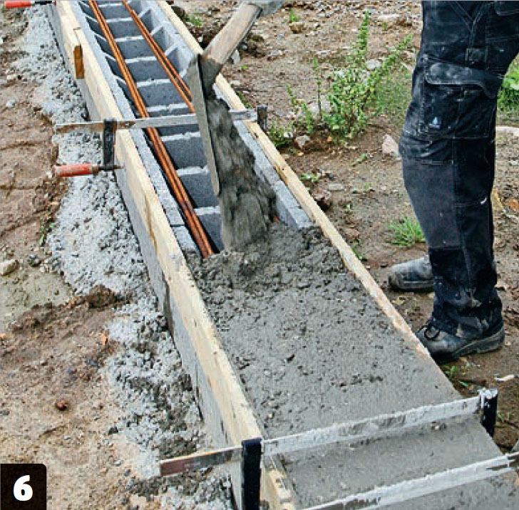 Bland sekkene med tørrbetong med vann, til konsistensen er som tykk grøt. På grunn av mengden trenger du som et minimum en tvangsblander, men du kan også velge å ringe en betongbil som kommer og pumper betongen dit du skal ha den. Det er litt dyrere, men sparer deg for mye slit og arbeidstimer. Den første raden med fundamentblokker plasseres i lodd og vater i fuktig betong.