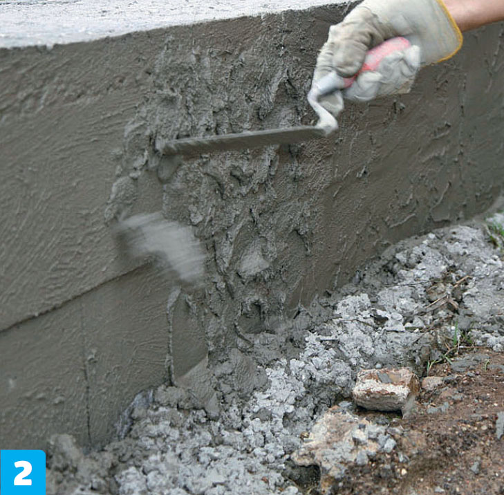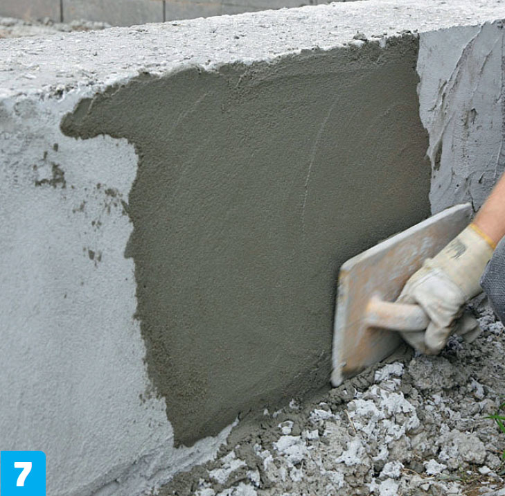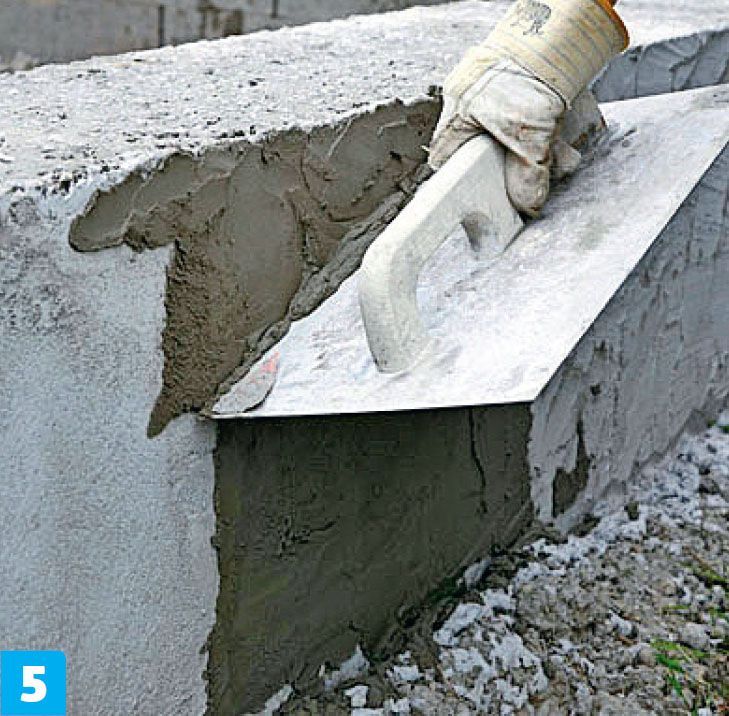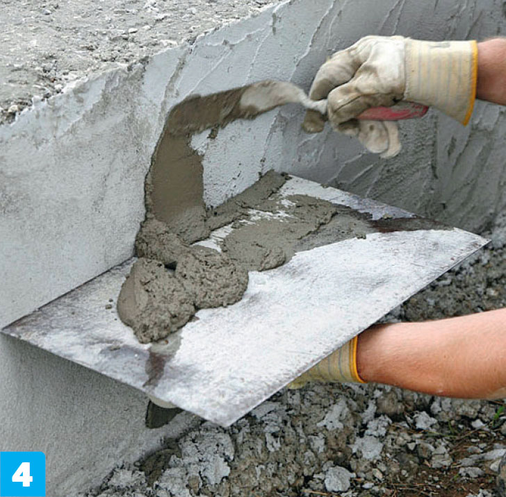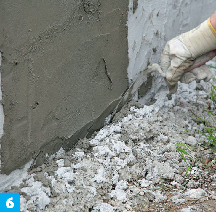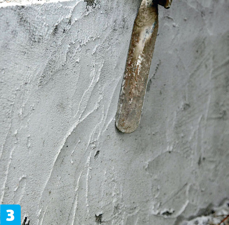 Nederst jevnes laget med murskjeen, slik at det blir en pen (tett) avslutning ned mot underlaget. Det skal ikke kunne trenge vann inn bak pusslaget.