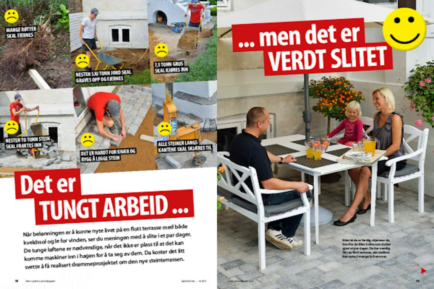 Det skal graves ned i ca 30 cm dybde til en terrasse som den vi legger her. Sett opp påler rundt det området det skal legges stein allerede nå. Da ser du enkelt at du får fjernet nok jord - og at underlaget er noenlunde plant.