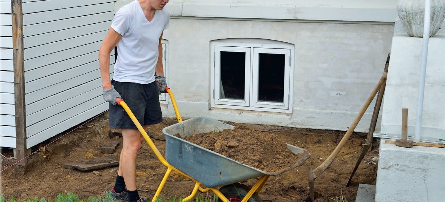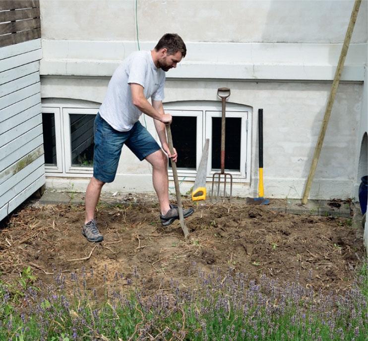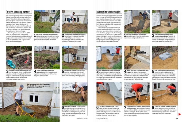 Så skal resten av underlaget rettes opp. Det er smart ikke å rette opp hele arealet i én gang, fordi du kommer til å gå mye på underlaget. Del opp arealet i to, og rett først opp den ene delen og legg stein der. Gjør det samme med resten.