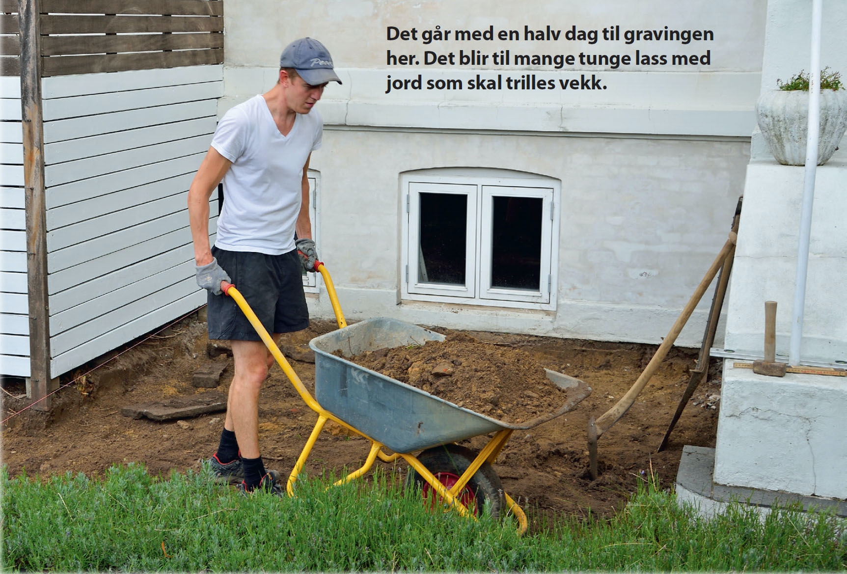 Så skal det graves og fjernes mye jord. Det øverste laget skal fjernes på hele arealet - i ca 30 cm dybde - slik at det er plass til bærelag, settelag og stein.