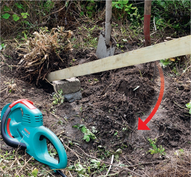 De gjenstridige røttene brytes opp. Hvis det er røtter som er vanskelige å få opp, kan du bruke en lang bjelke. Press den langt inn under røttene, og legg et par stein under. Da kan du bruke bjelken som vektstang, og vippe opp røttene.