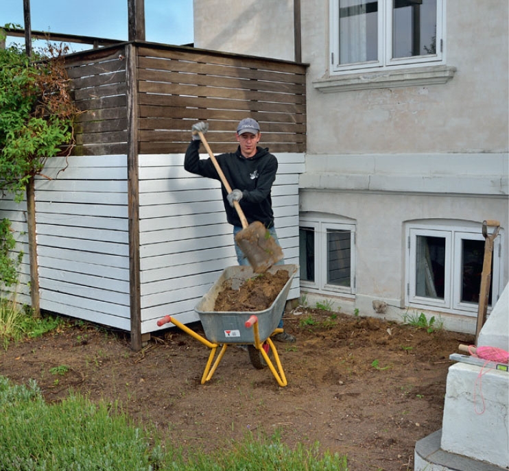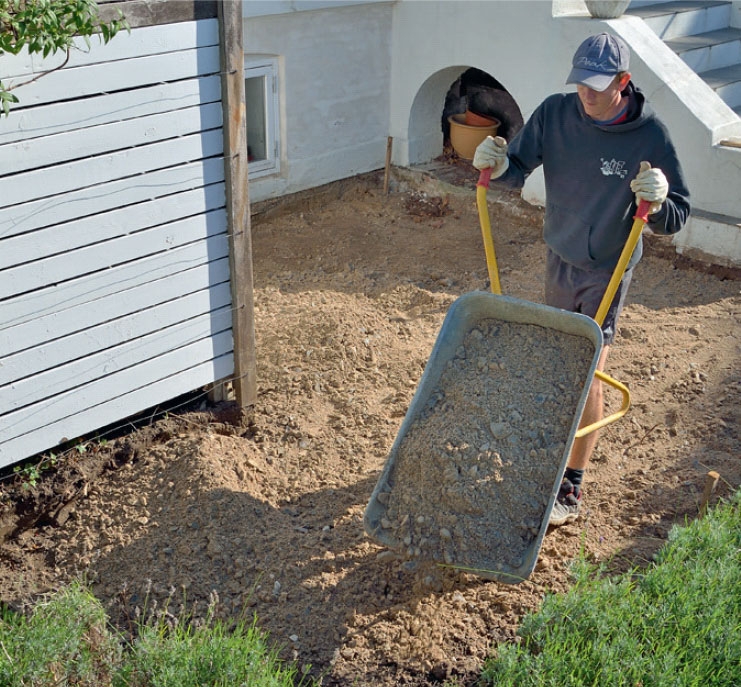 Fyll opp bærelaget oppå jorden. Bærelaget lages 15 cm tykt, og fordeles så jevnt som mulig med trillebåren.
