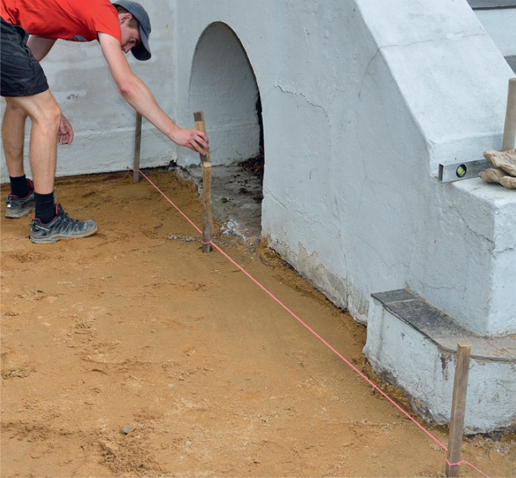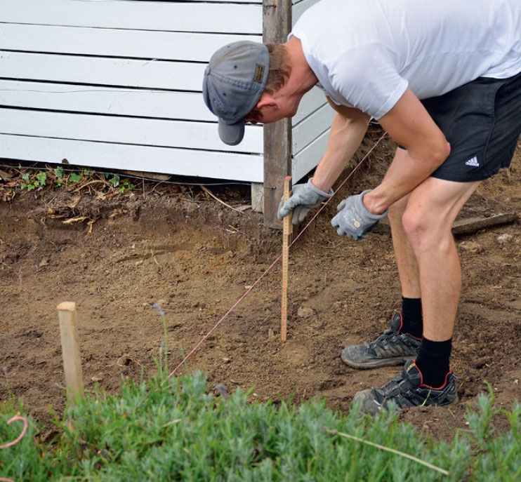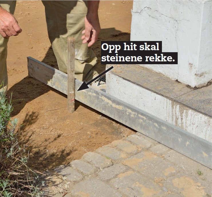 Merk opp hvor høyt steinene skal rekke. Her skal den nye terrassen ligge i nivå med en eksisterende belegning, så det er den vi måler ut fra. Med et merke på pålene er det lett å måle opp hvor mye av settelaget som skal trekkes av.