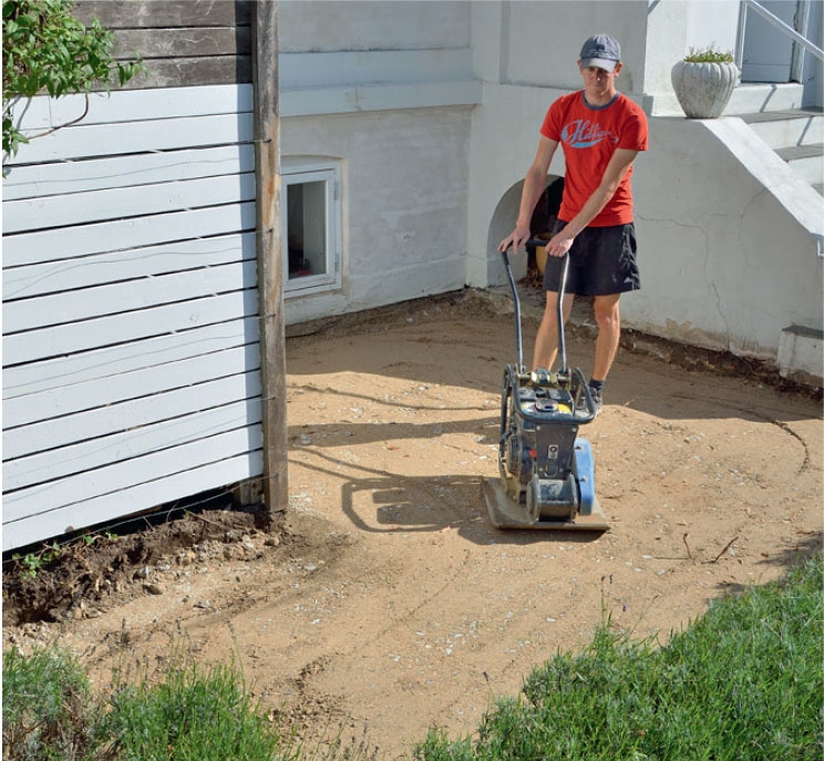 Underlaget stampes grundig med en platevibrator, til det er så komprimert som mulig. Da minimerer vi riskoen for setninger i belegningen. Kjør over et par ganger på kryss og tvers.