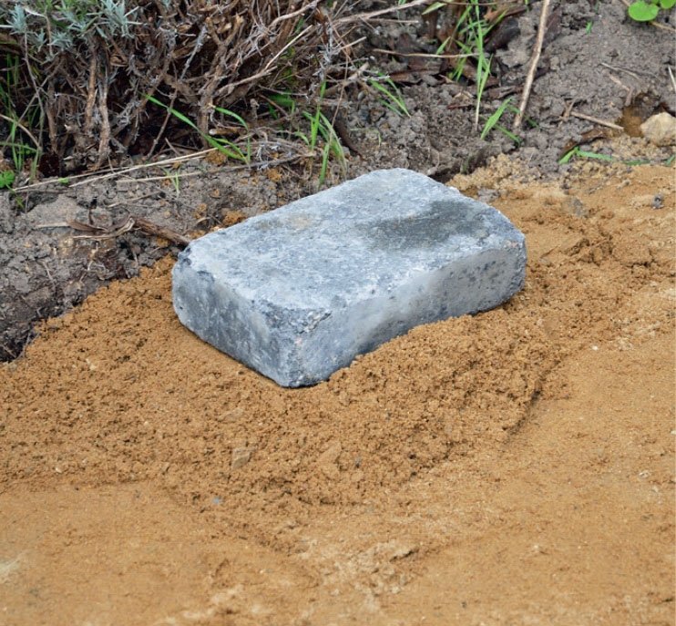 Gjør eventuelt en prøvelegging. Det er fort gjort, og gjør at du vet nøyaktig i hvilket nivå steinene skal ligge. Legg en stein på en haug med settesand, og bank den i riktig nivå. Da kan du sjekke i forhold til steinen når du spenner ut snor.