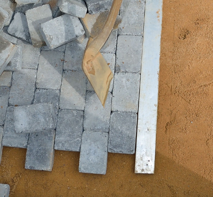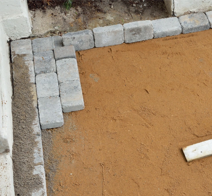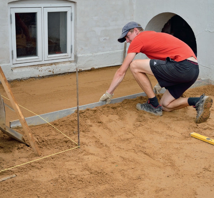 Fyll settesanden oppå bærelaget. Vi legger den ut i cirka 10 cm tykkelse, og fordeler den så jevnt som mulig. Det skal være så mye sand at det er mulig å trekke det rett i riktig nivå. Kjør deretter over et par turer med platevibratoren igjen.